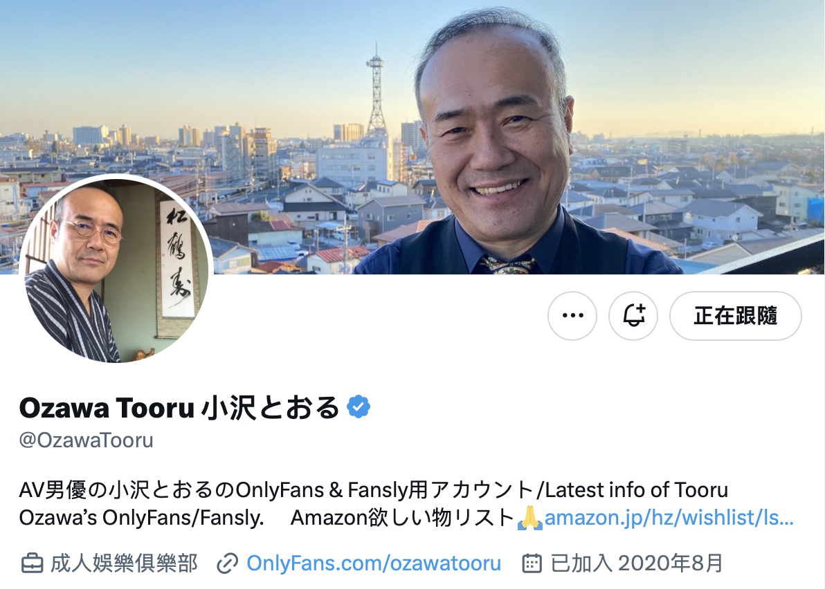 在現實生活中千萬不要這樣喔,不過在AV的世界裡,我覺得小沢とおる(小澤徹)演社長比義父(丈夫的爸爸)更有說服力:一來是穿西裝背心他還真有幾分氣勢,二來他也真的有夠會親,看他一直親一直親讓女優從噁心屈辱到後來被征服的模樣我就覺得這男優應該是真的吻功了得,也難怪和其他男優不同,小沢とおる(小澤徹)不但在社群上蠻活躍的有大批追蹤者,甚至還開了Amazon Wish List(就是Amazon的連結讓你可以買禮物送他)以及可以訂閱的OnlyFans: