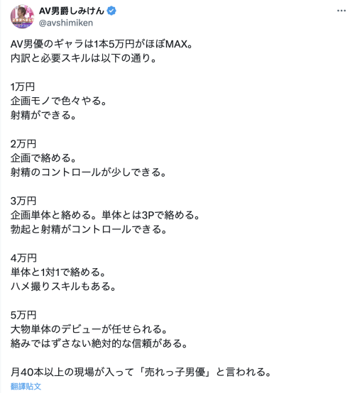 知名男優しみけん(清水健)是在自己的X(https://twitter.com/avshimiken)詳細寫出了片酬的數字以及必須要具備的能力,廢話不多說,直接翻給大家看: