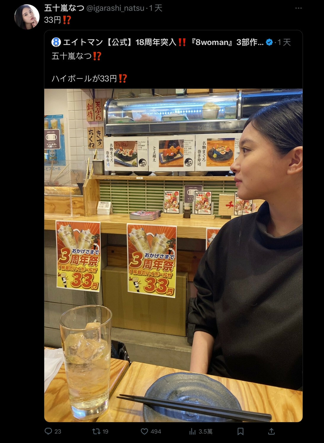 其實也沒寫什麼,就是經紀公司發文說在居酒屋的五十嵐なつ(五十嵐夏)發現一杯ハイボール(HighBall)只要33円(台幣7元左右),這大概是和歐陽妮妮發現口袋有200元一樣是個無聊的新聞;不過重點是好久不見的五十嵐なつ(五十嵐夏)藉著這篇發文重回大家的視野,在相隔五個月後表態「我還在」: