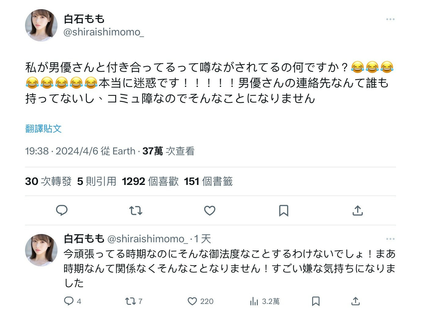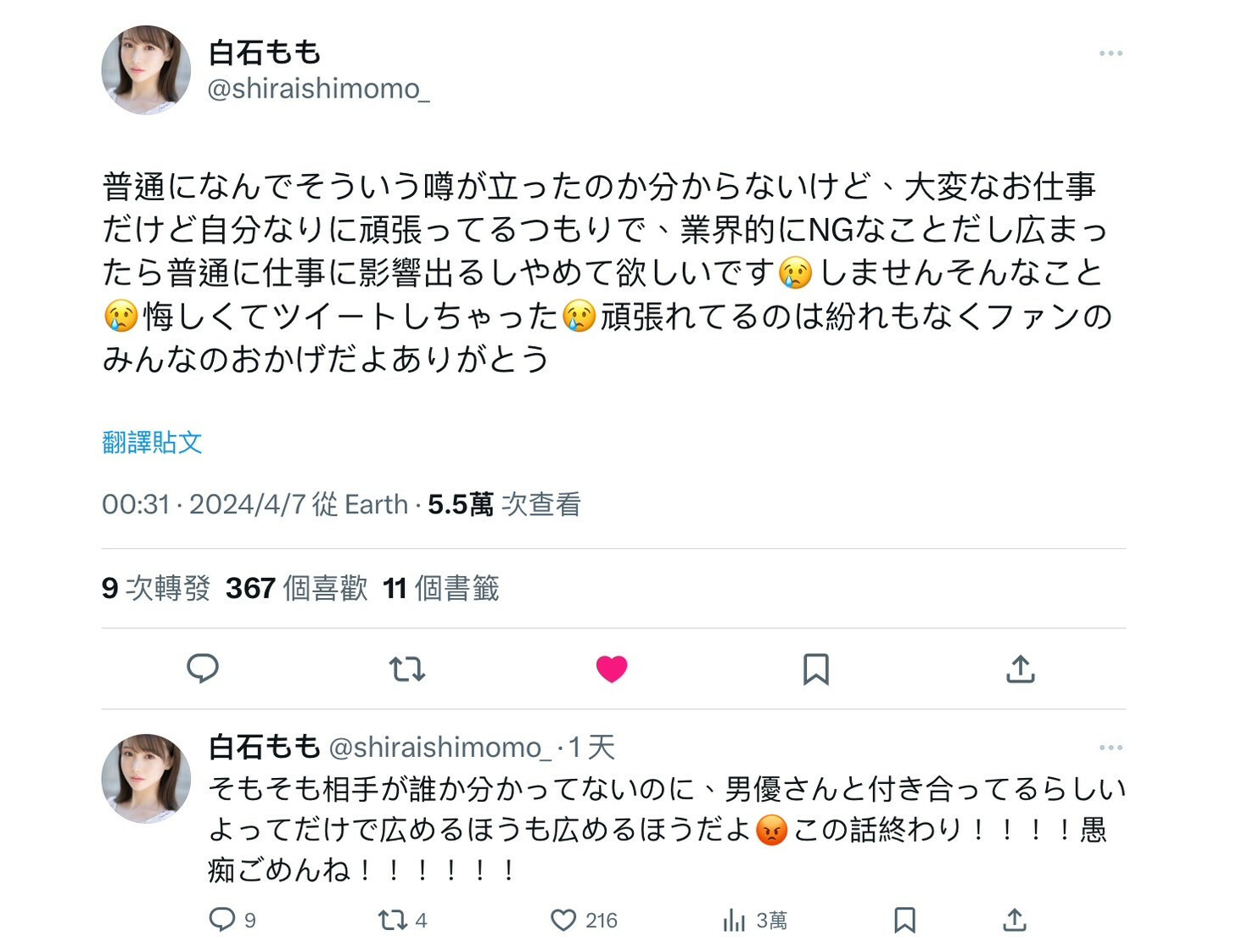 為什麼她這麼不開心?原來她在X(https://twitter.com/shiraishimomo_)自爆最近業界流傳她的緋聞,很多人以為她和某個男優在談戀愛⋯