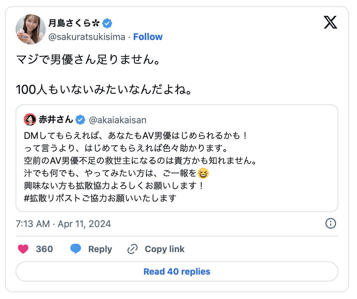 業界反新法的代表人物,也是AV女優的月島さくら(月島櫻)證實了赤井さん的說法,她說目前業界的男優應該不足100人吧,對比女優如雨後春筍般地出道真的是敵眾我寡棒子不夠用,狀況不太妙⋯