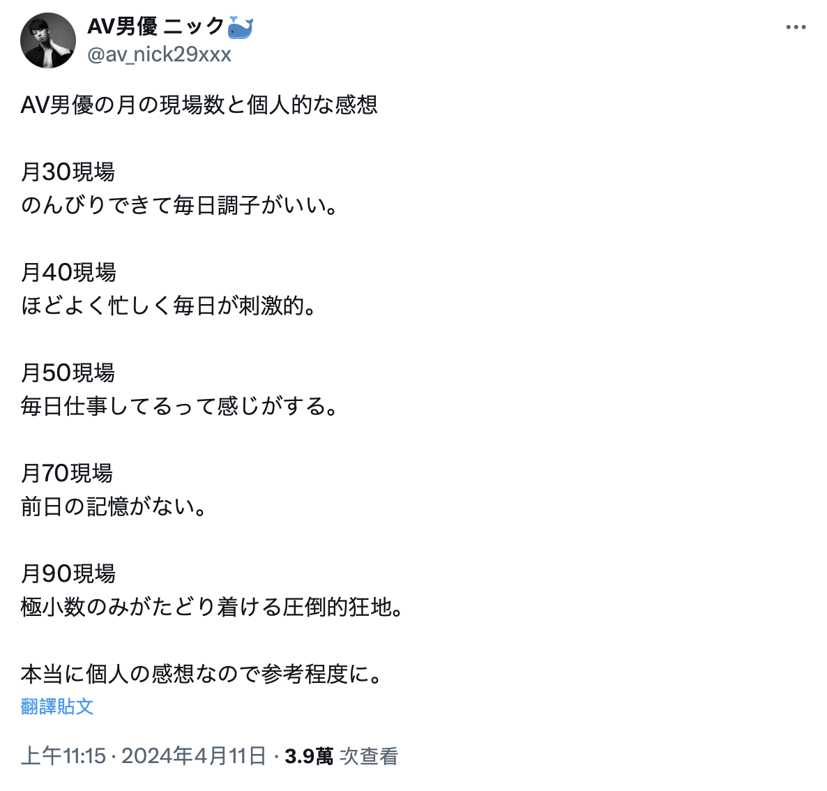 然後這個計算的單位叫做「現場」,只要身體負荷得了可以硬也可以射然後做好時間管理大師那一天3到4個現場也是OK的。而ニック(Nick)的發文則是以一個月為準,以工作的數量來講自己的感受: