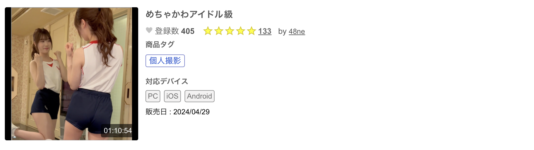 這是番號FC2-PPV-4409072的作品「めちゃかわアイドル級」,標題的意思是超可愛的偶像級水準,我想這就不用多解釋了,封面上這位穿著背心以及小短褲的女優肯定非常卡娃依,有多卡娃依呢?請看〜