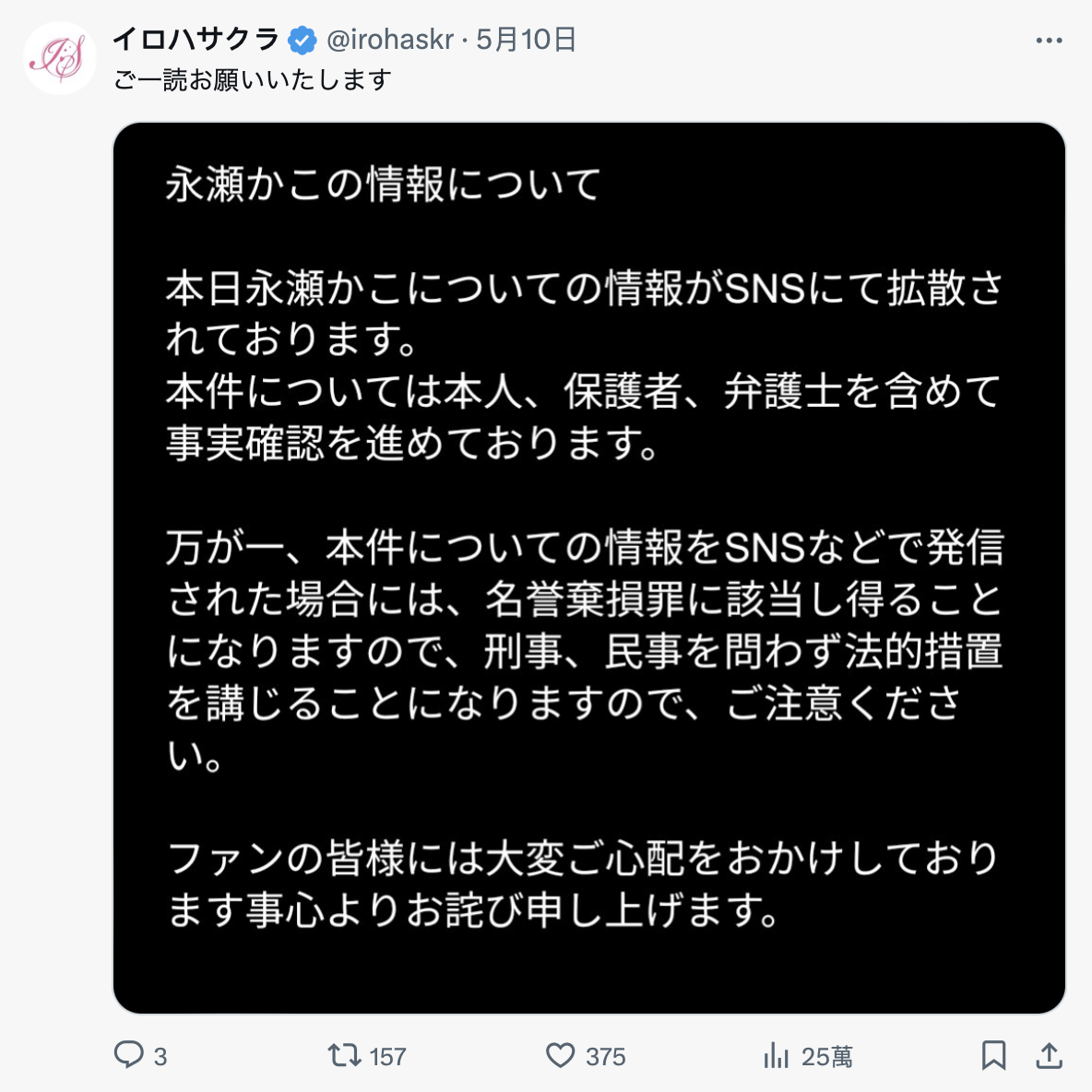 我們已經注意到永瀬かこ(永瀨加子)的情報在社群上快速擴散,目前正和本人及其監護人還有律師進行確認,請不要隨便傳播那個訊息,否則可能會構成誹謗罪,我們會針對刑事和民事的部分採取法律行動!