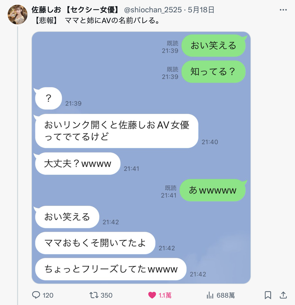 經紀公司ACT所屬的企劃女優「佐藤しお(佐藤汐)」是在自己的X(https://x.com/shiochan_2525)貼出Line的對話,姊姊是直球對決地說打開了某個抖音的連結有個名叫佐藤しお(佐藤汐)的AV女優: