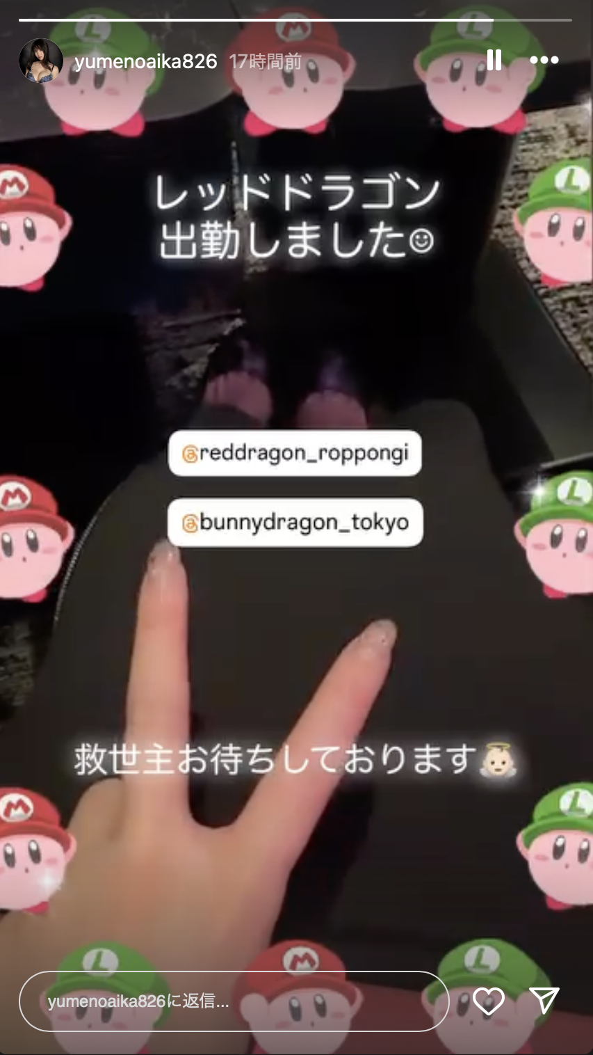 我們都知道她已經好久沒有作品也沒有公開的活動,我們也都知道她固定會去レッドドラゴン(紅龍,RedDragon)出勤陪酒然後在IG限動上Po文希望有救世主捧場(https://www.instagram.com/yumenoaika826/),但不要說主辦單位了,我自己也超想看到她站在TRE的舞台上讓大家發出興奮的狼嚎,所以收到主辦單位的名單後我們不但和事務所做了完整的說明,還有好幾個去レッドドラゴン(紅龍,RedDragon)玩的台灣粉絲也和夢乃あいか(夢乃愛華)說參加TRE好處多多,請她務必參加: