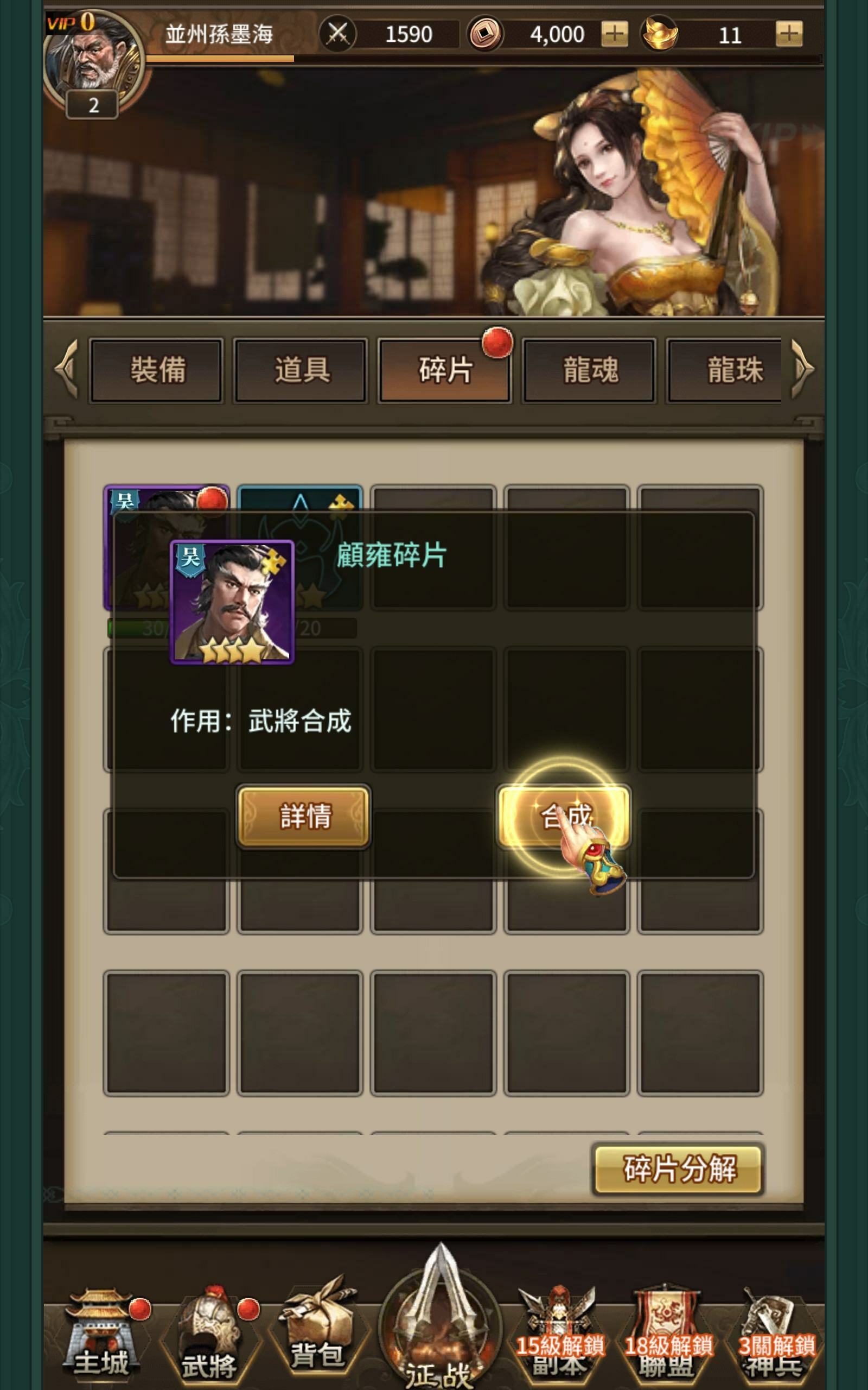 然後就開始打架了,淫遊三國就是很一般的掛機遊戲,你一個人不夠就要多找幾個人打架,每天都可以一般抽獎有機會有也可以大抽一把,然後我就得到了孫尚香: