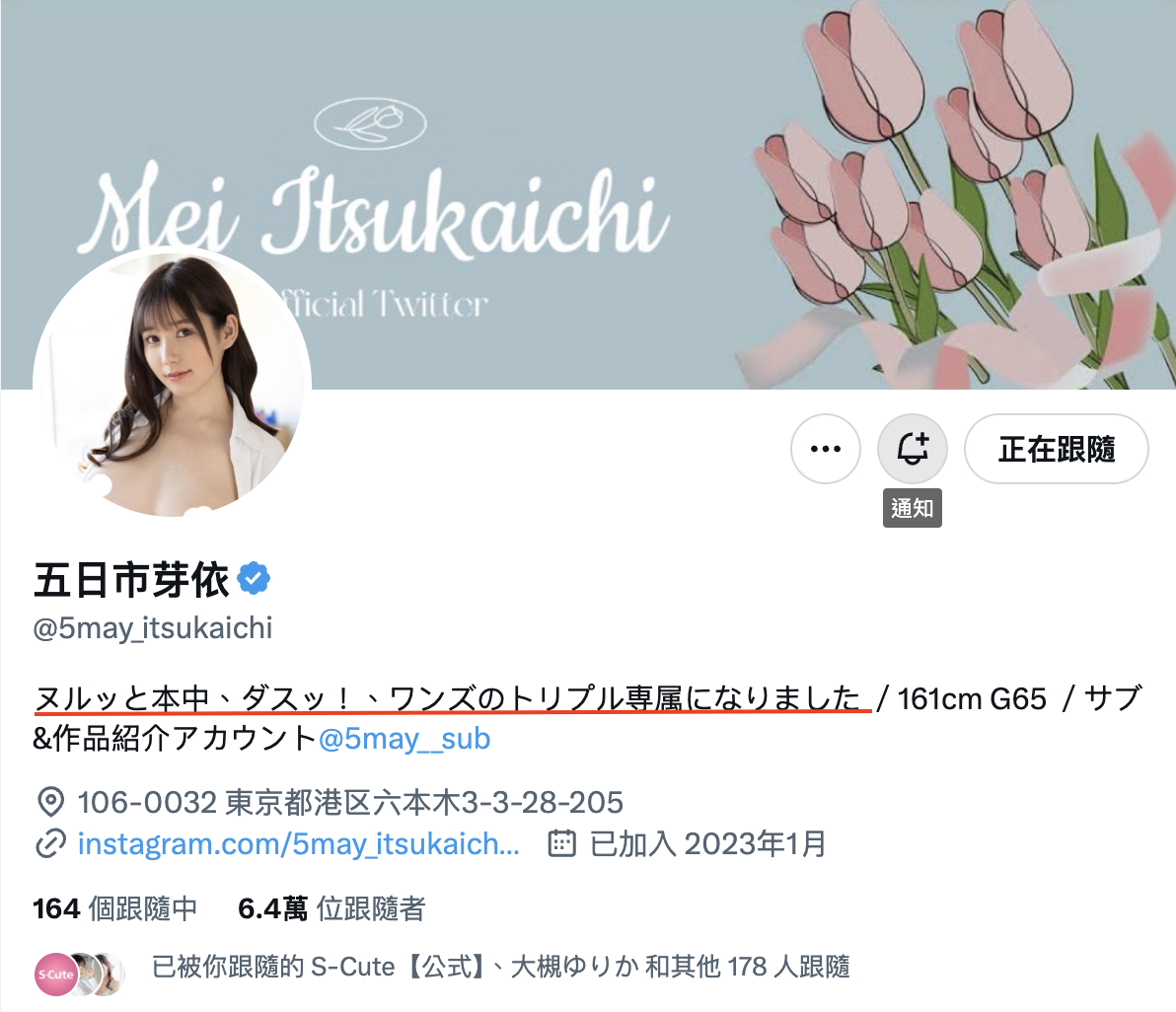 因為文案的第一句就是「祝ダスッ!専属1本目」ー是的,她成了片商ダスッ!(DAS)的專屬女優,而且不只這家片商,從五日市芽依在社群上的自我介紹就知道現在的她同時是本中、ダスッ!(DAS)以及ワンズ(WANZ factory)三家片商的專屬女優....