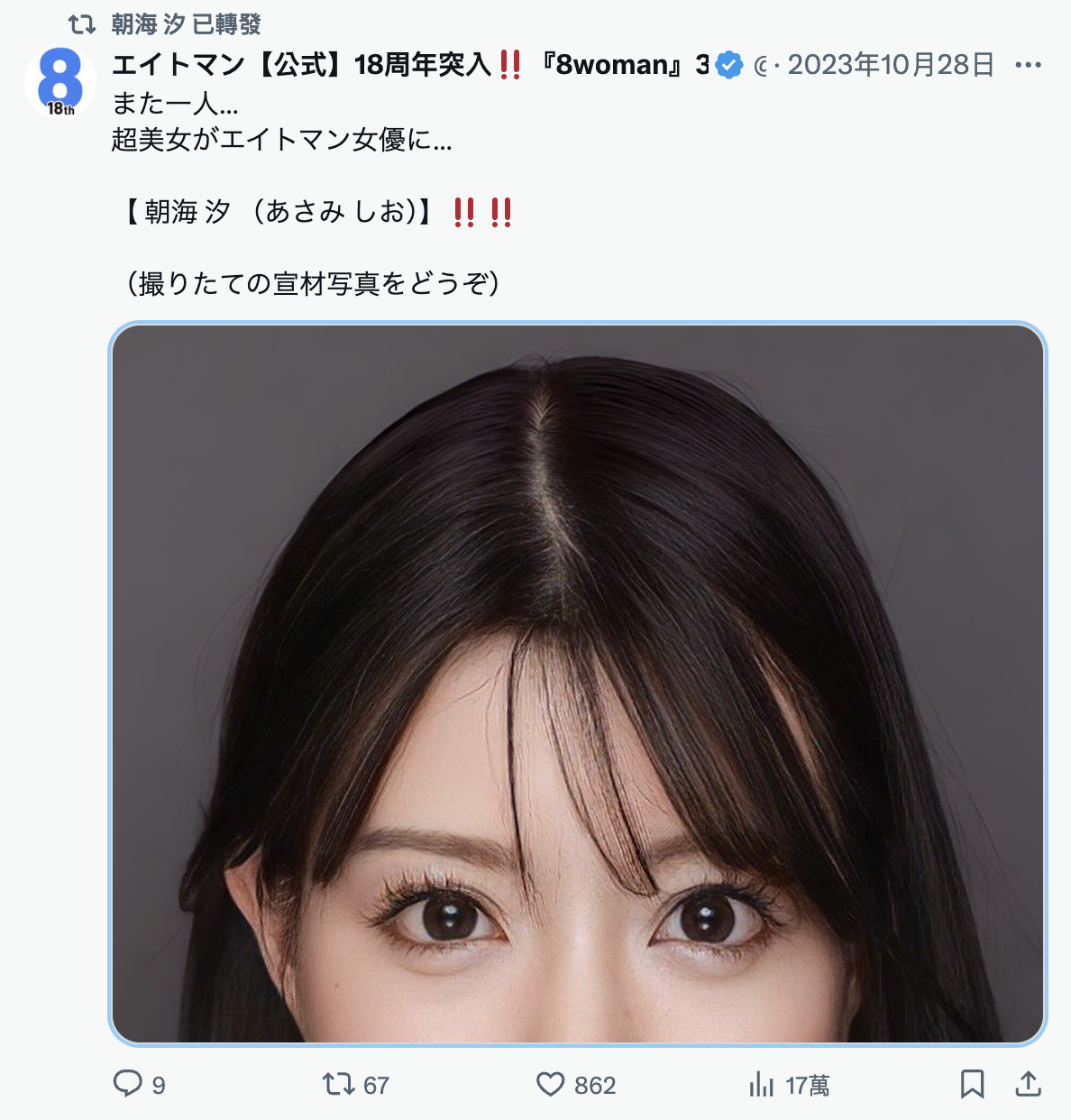 其實扣掉說不會拍片的女神ジュン(女神純),エイトマン(8MAN)手上還是有一些值得期待的女優,比方說好久不見還被暗示7月會有動作只是後來刪文假裝沒這回事的「星まりあ(星麻里亞)」、比方說奶那麼大腿那麼長即將展開AV人生第二章的「神木蘭」,還有被很多人認為是暗黑子瑜的鳳みゆ(鳳美優)⋯寫到這邊不知道你注意到了嗎?エイトマン(8MAN)這邊受期待的女優不是片子發一發就卡住了就是從其他事務所挖角來的但休息了很久很久,不能說完全沒有期待但她們就不會是那種片子一出就輾壓所有人的超大型新人,所以朝海汐可以說是這家自稱和最強事務所近期的希望所在,我很想知道她到底有多美?也很期待エイトマン(8MAN)會讓她在哪一家片商出道?