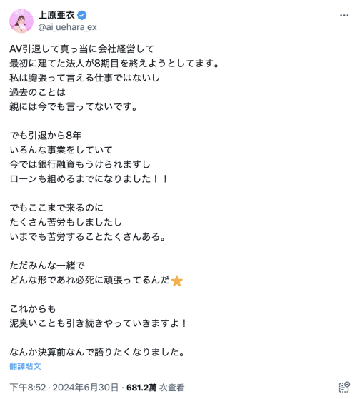 那這次又是誰炎上?答案是上原亜衣(上原亞衣),炎上的原因是她在6月30日於X(https://x.com/ai_uehara_ex)的發文,意思是她自AV引退後就創業搞公司,到現在已經八年了,雖然現在的工作還要好好努力、過去的一切也沒有和家人們說,但現在已經可以得到銀行貸款了,未來她會不畏艱險、勇往直前〜