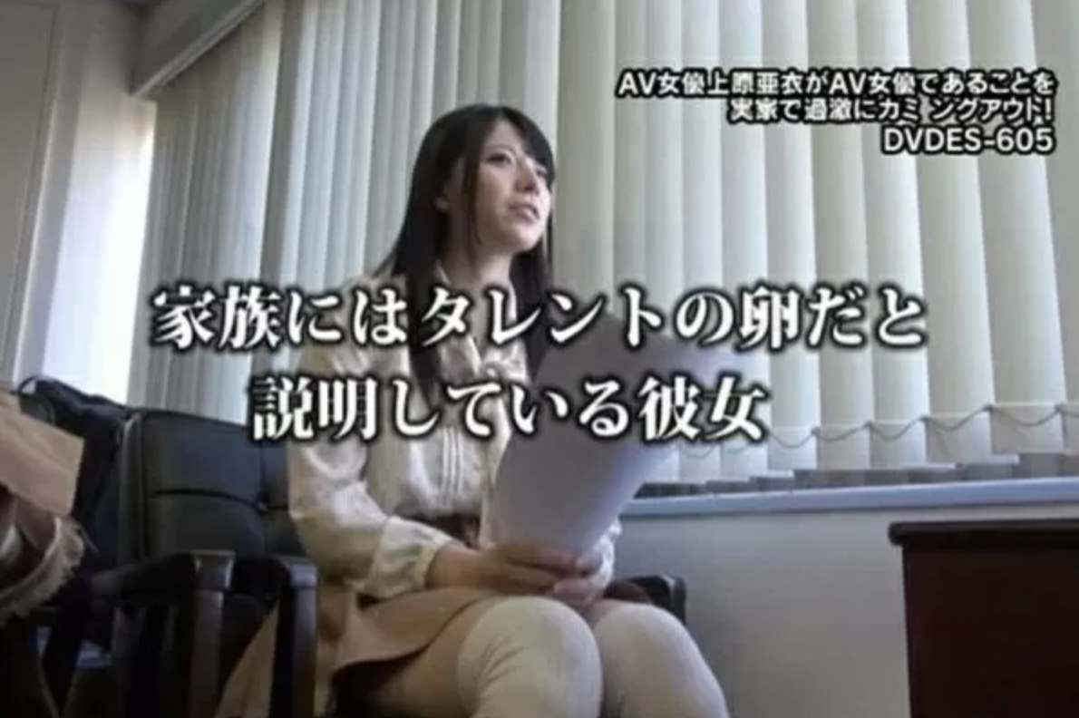 他講的作品是上原亜衣在2013年的作品「AV女優上原亜衣がAV女優であることを実家で過激にカミングアウト!」,番號DVDES-605,片商是Deep’s,導演「朝霧浄」,故事是說上原亜衣回到老家和家人們報告自己要加入演藝圈,接著事情急轉直下,她成了AV女優的事曝光,於是她開始展現自己的「專業」,不只在媽媽和姊姊面前和弟弟做了起來然後還水淹金山寺大潮吹最後還中出了,很有Deep’s這家片商劇情暴走的風格⋯
