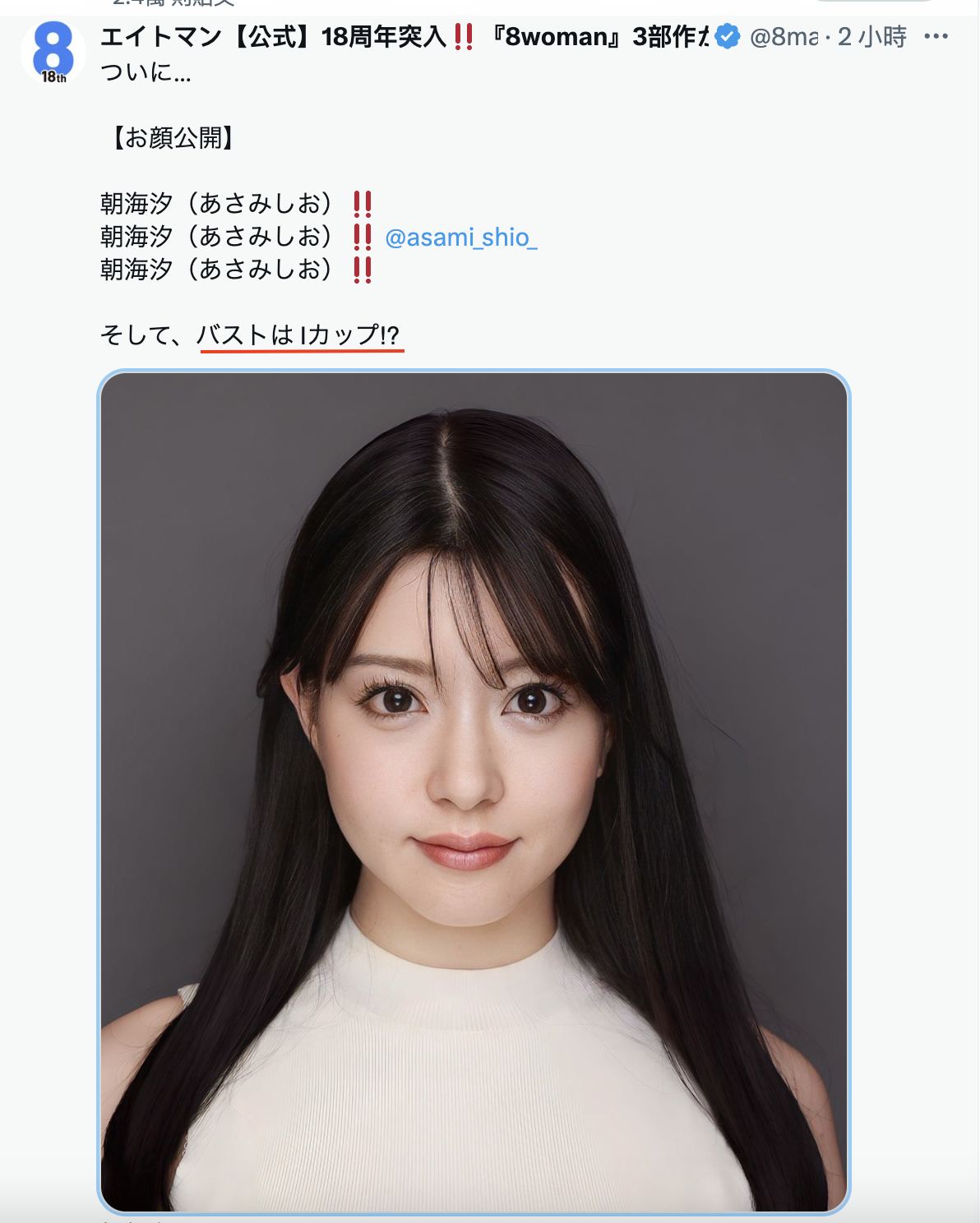 是誰現出廬山真面目呢?是經紀公司エイトマン(8man)的秘密兵器「朝海汐」,我上次說又是海又是汐的這位新人應該很多水,但重點是她臉蛋如何?今天,向來很會行銷的經紀公司エイトマン(8man)終於公布真相了: