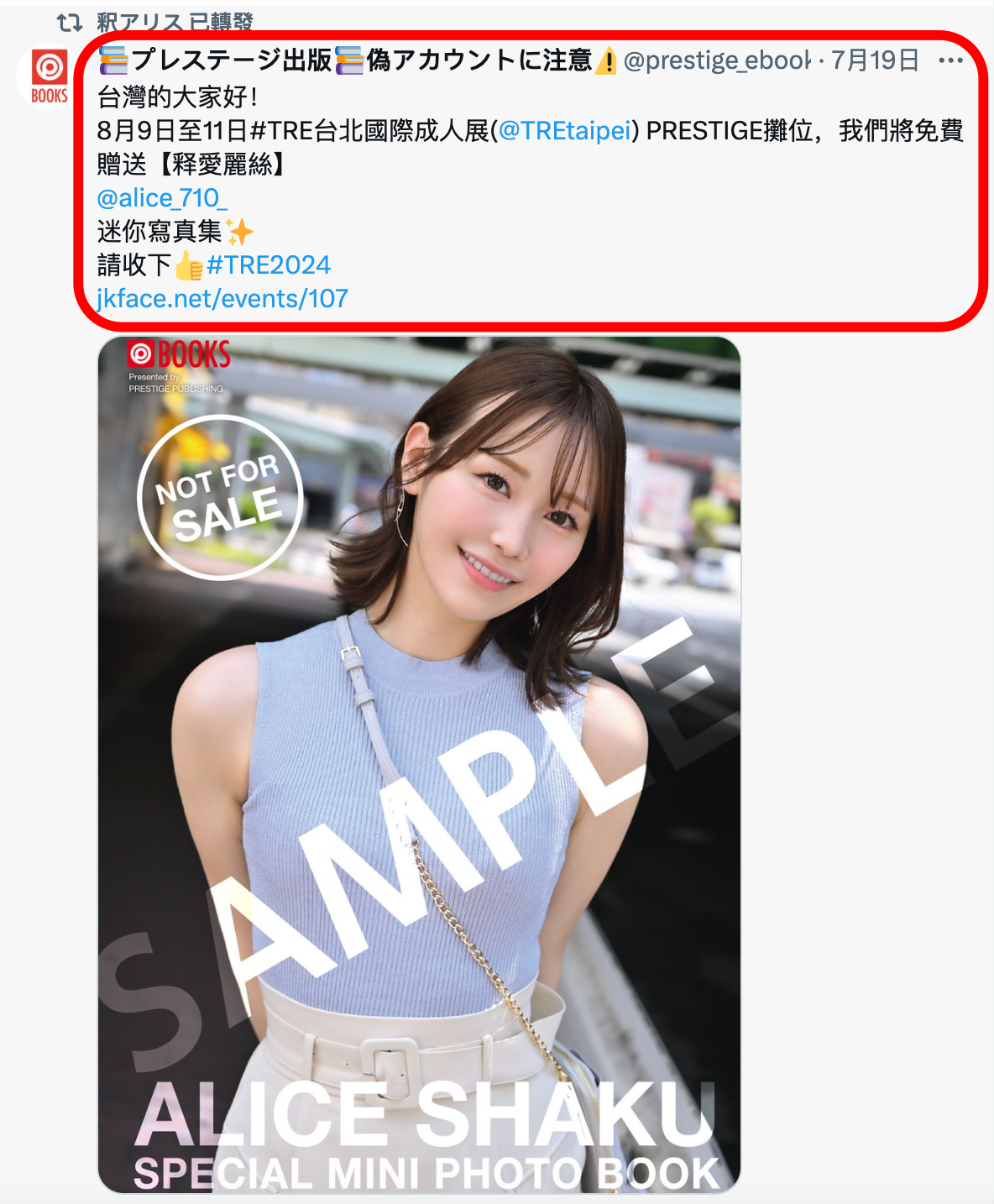 有在關注TRE台北國際成人展的朋友,應該都注意到Presitge攤位有位名叫「釈アリス(釋愛麗絲)」的姑娘吧?
