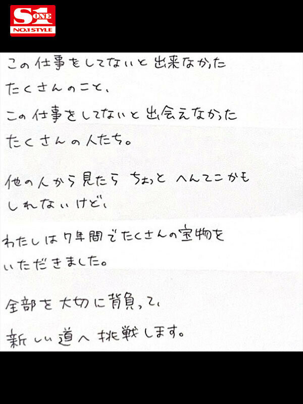 結果片商也很有意思,劇照就給了我們三張架乃ゆら(架乃由羅)的手寫信,內容就是她的引退聲明:出道已經七年、在這支作品後就不再是AV女優了,在這一行待這麼久,遇到了很多很棒的人,每一次的拍片也都很快樂,這七年的時光會是她一輩子最寶貴的經驗;接下來架乃ゆら(架乃由羅)要朝向新的目標邁進了,人生的第一章畫上句點、第二章才正要開始,這七年真的非常非常謝謝大家支持,我們會再見的~