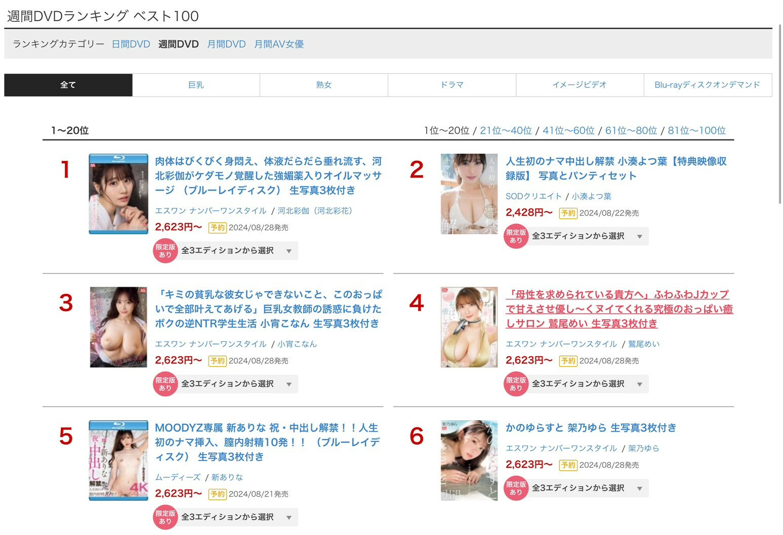 這是本週FANZA的銷售排行榜。