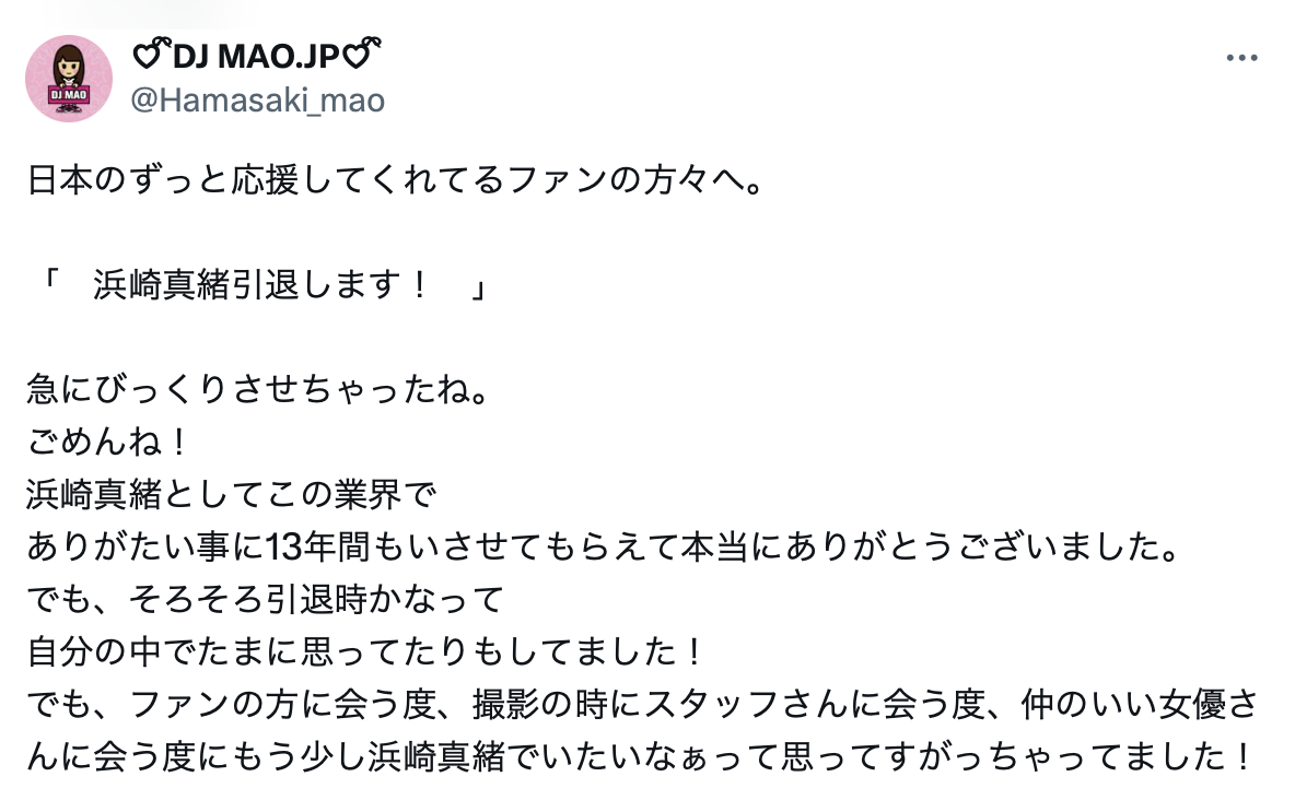 現場根本沒時間問,更何況浜崎真緒也不是我們攤位的來賓,突然衝去問也蠻失禮的;不過還好,到了晚上她就在自己的X(https://x.com/Hamasaki_mao/)上說明了:她說能以浜崎真緒的名字在這一行待13年真的非常感謝大家支持,不過最近時不時地在想,好像是引退的時候了:
