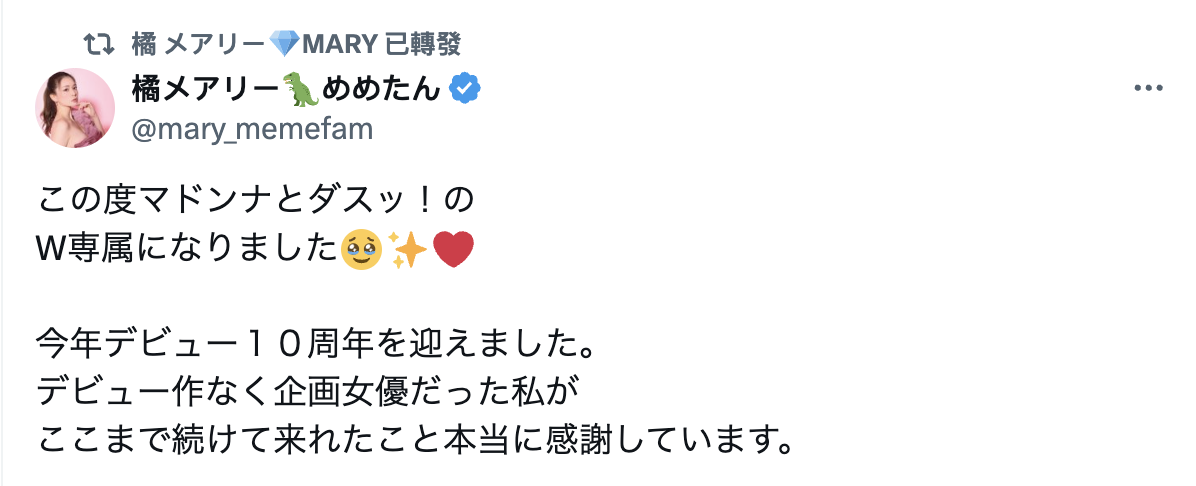 是的,沒錯,從9月開始,橘メアリー(橘瑪麗)就不再是遊走各片商的企劃女優而是被片商框下來當專屬女優惹;而且不是只有Madonna喔,橘メアリー(橘瑪麗)有在自己的X上爆料(https://x.com/mary_tachibana),不只是Madonna,接下來她還會在ダスツ!(DAS)發片: