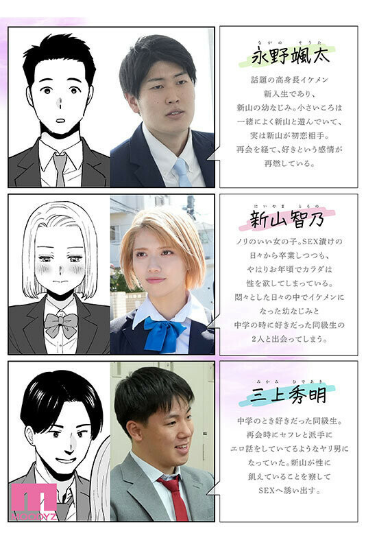 永野颯太,「大村」飾,是新山智乃(石原希望 飾)的兒時玩伴,小時候一直被惡作劇讓他對新山智乃印象深刻,在轉學到了同一所高中後轉為暗戀;三上秀明,「ニック(Nick)」飾,是新山智乃(石原希望 飾)中學時代就認識的同學,因為長得帥所以上了高中後就到處找炮友,石原希望飾演的新山智乃因為覺得和永野颯太不太適合後遇到了他,三兩下就被勾引去了卡拉OK做愛⋯
