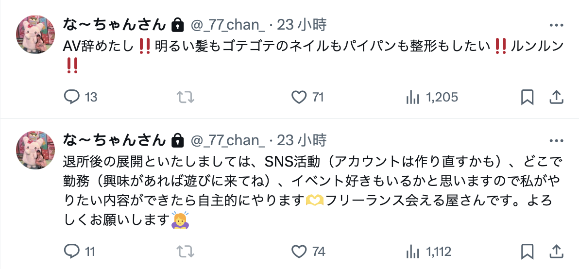 為什麼要加啾咪呢?因為漆なな(漆奈奈)對離開事務所不拍AV應該是蠻開心的ー不過別懷疑,我不是暗示她討厭這一行或是和事務所及經紀公司翻臉,而是在她的小號(https://x.com/_77_chan_,已鎖帳)是這麼寫的ー