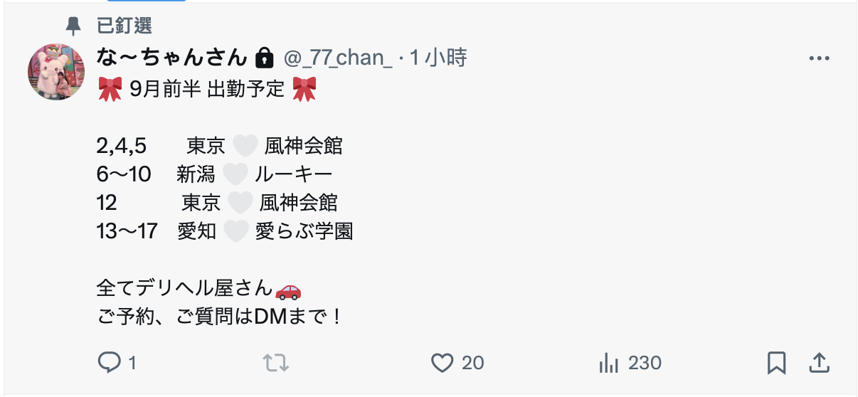 小號置頂文就告訴大家9月可以到哪裡找她,所以什麼拍過寫真當過偶像還參加過戶外活動都已經是過去,現在她就是個不做AV女優專心做風俗的外送茶了⋯