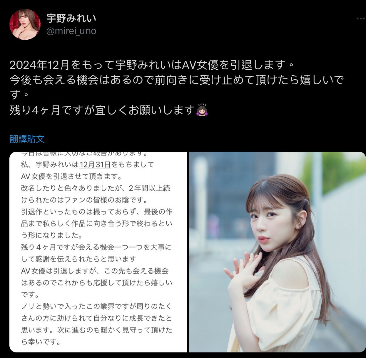 大概在年中的時候,台灣某廠商就在群組內爆料宇野みれい(宇野美玲)會在年底引退,在知道消息來源後我就認為不是宣傳花招,而昨天,宇野みれい(宇野美玲)就在X(https://x.com/mirei_uno)向大家報告了: