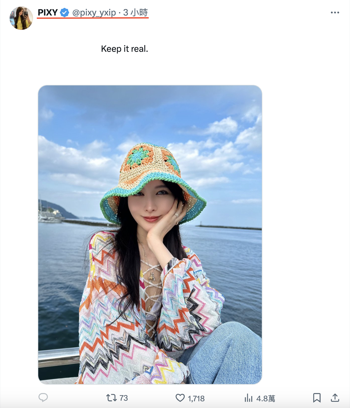 雖然名字也改成PIXY了,但ID沒變,還是epoint2016(https://www.instagram.com/epoint2016/),不知道是忘了改還是不想改?然後與X同步,兩個帳號發的都是同一張照片加「keep it real(忠於自我)」的說明ー照片裡的她看似是坐遊艇出海去玩,笑容可掬,看起來日子過得蠻悠閒的〜