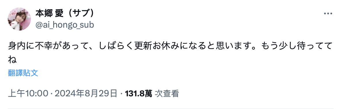意思是「因為發生了不幸的事情,所以社群會暫停更新一陣子,請大家稍等一下」,我們當然都能體諒本鄉愛,社群不更新沒關係,期待妳滿血復活喔〜