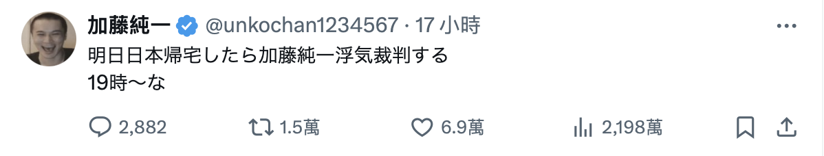 由於加藤純一曾經被抓到購買本鄉愛的作品,再加上本鄉愛也曾經直播中穿過大谷翔平的球衣,所以整個故事似乎是串起來了;本鄉愛現在因為有不幸的事情暫停更新社群當然什麼沒有寫,而加藤純一則是在自己的X說回到日本後要進行「外遇審判」,日本時間晚間七點要直播:
