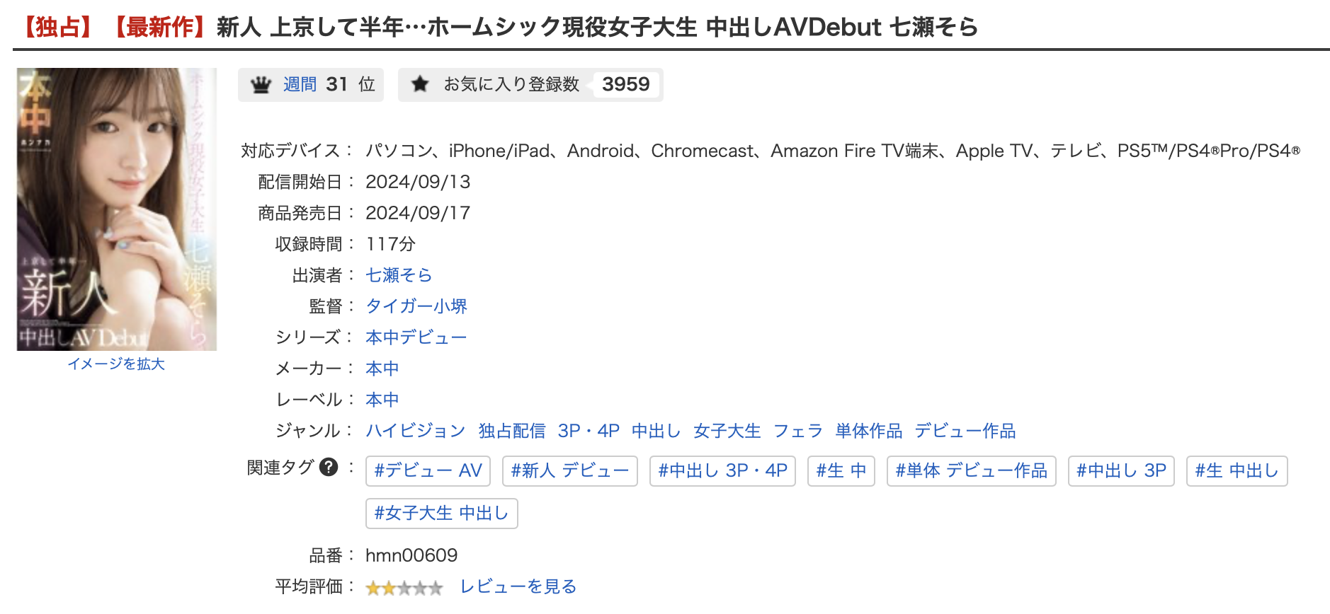 然後再看看作品的銷售頁面,在FANZA,七瀬そら(七瀨空)這支作品目前高居本週串流排行榜的第31名,希望買片回去的朋友都喜歡,不要怒火中燒拳頭硬了ー