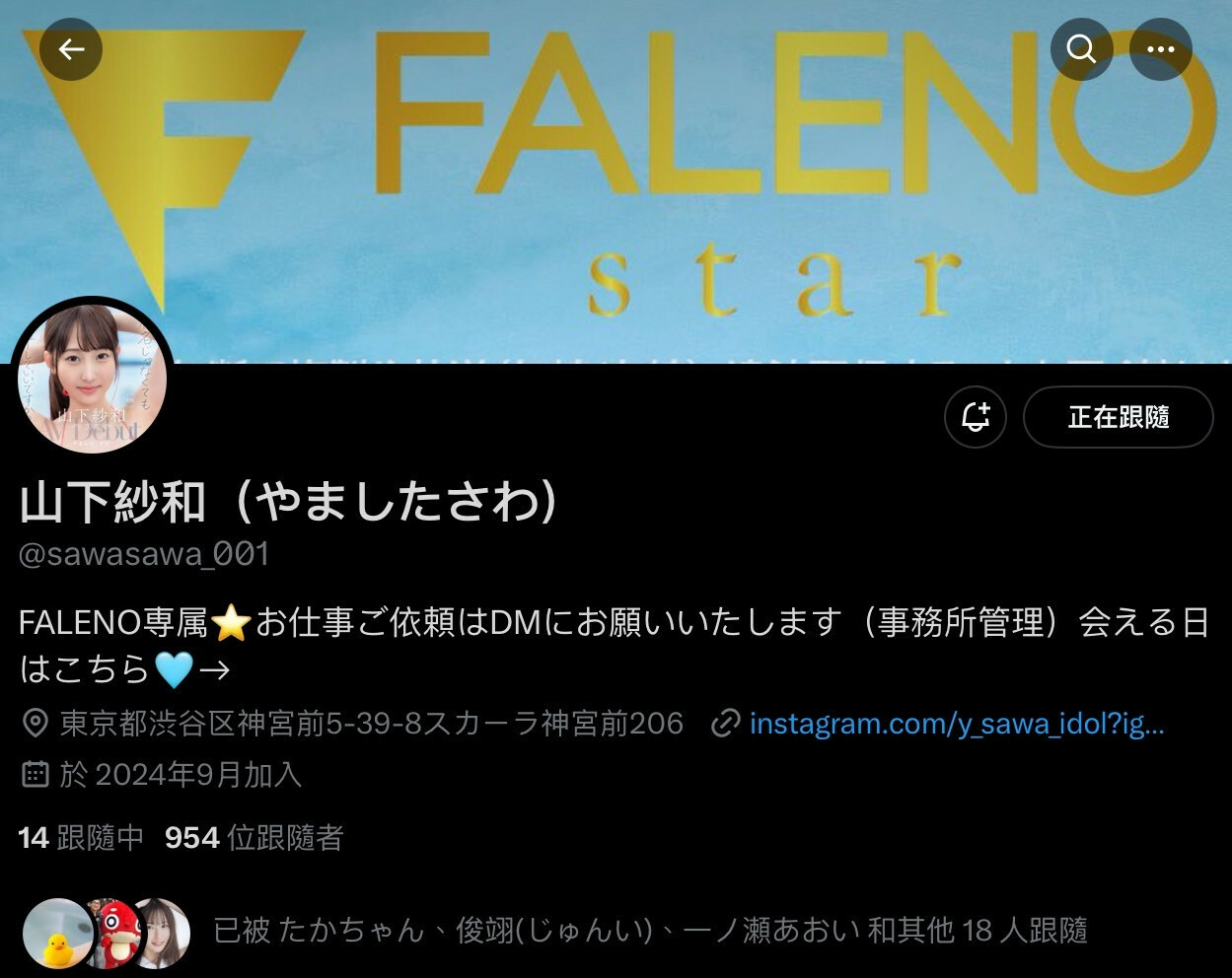 其實最近失去帳號的女優不只RARA一個,片商FALENO STAR的新人「山下紗和」更衰,出道作剛公布沒多久帳號就和RARA一樣失去了帳號,但她因為生涯才剛起步所以很乾脆地註了新的帳號(https://x.com/sawasawa_001),只是到目前為止追蹤還不到1000人: