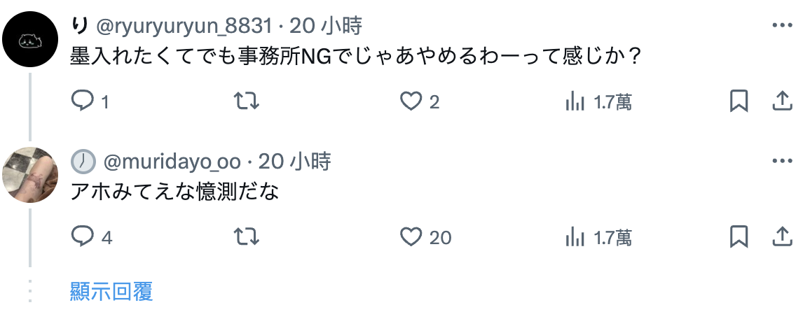 她的頭像是個大腿上的刺青,而這個人是前陣子狀況很多的「弓乃りむ(弓乃凜夢)」:大家都知道她是拍過無碼的前寫真偶像須田凛夢,先在SOD專屬出道後引退了一陣子、復出後在另一家片商ダスッ!(DAS)繼續擔任專屬女優但不久前突然瘋狂刺青然後說要賣有22萬追蹤的X本帳(https://x.com/7_plastic),明顯是又不玩了⋯