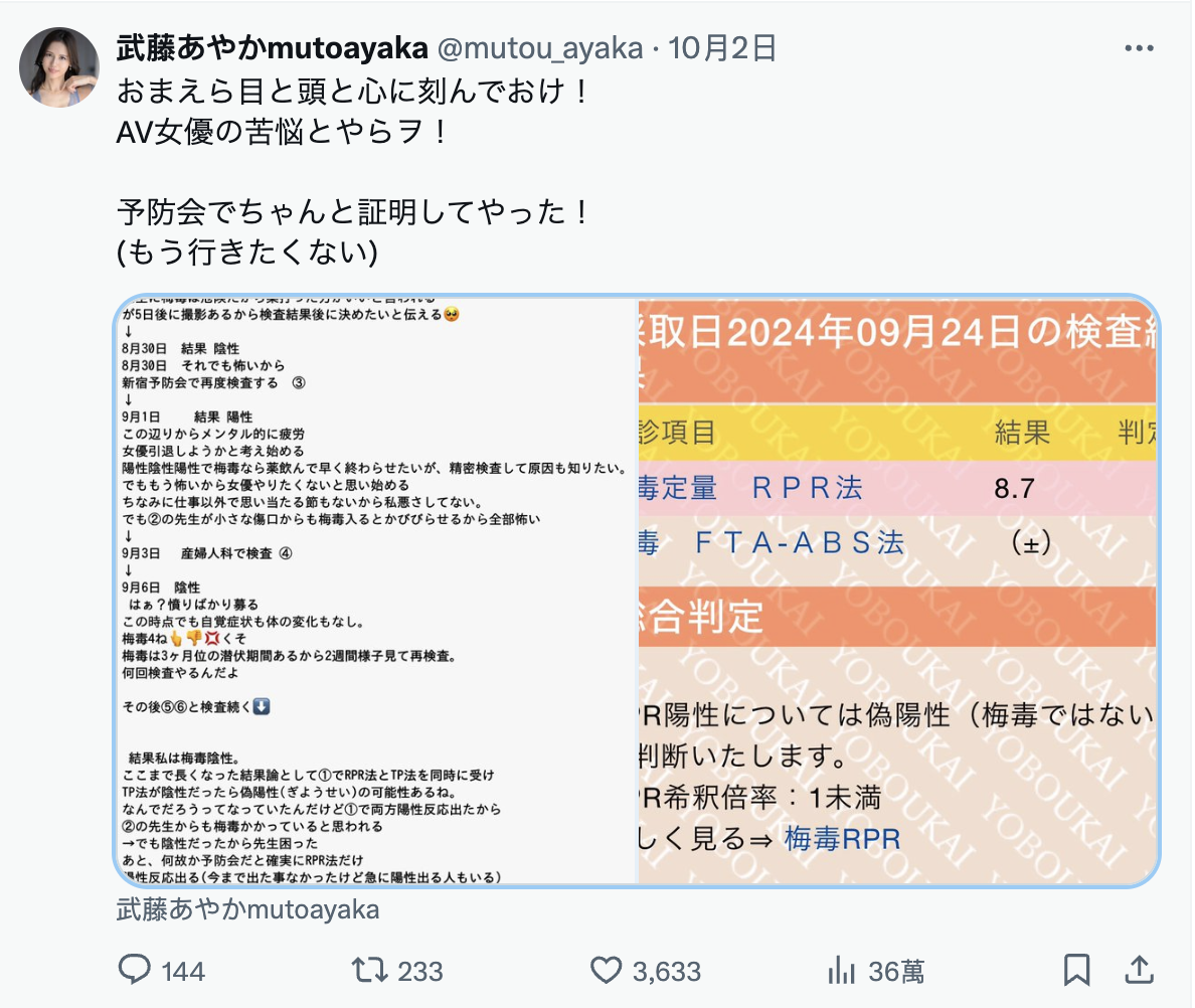 Madonna專屬女優、42歲、以氣質和腹肌聞名的「武藤あやか(武藤彩香)」最近就在X(https://x.com/mutou_ayaka)自爆前些陣子被驗到梅毒陽性的事:8月24日,她進棚攝影,狀況不錯,完全沒感受到異狀,過了兩天,她按照計畫去做性病篩檢,身體完全沒有不舒服,但到了8月29日,到了另一家診所複查的時候醫生告訴她狀況不太妙,可能要吃藥⋯