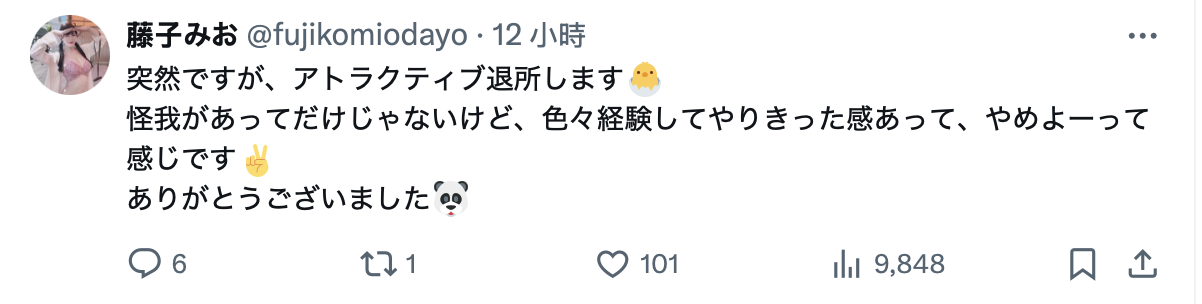 有在注意社群的朋友應該知道,9月中的時候,藤子みお(藤子未央)告訴大家因為出了點意外,所以去住院了ー而且看起來不是小事,她之後的攝影計畫全部都取消了,雖然當時說身體康復後會回到AV界繼續投入工作,但最後藤子みお(藤子未央)還是沒了: