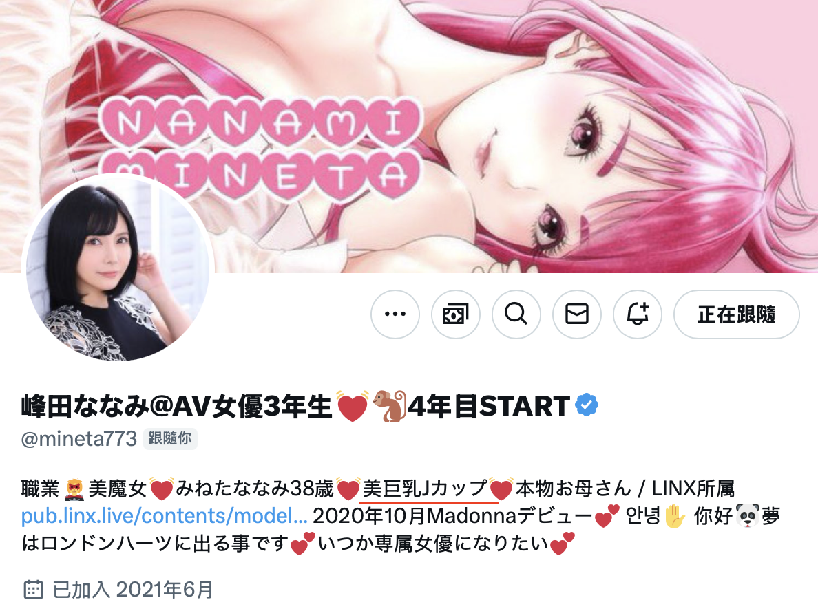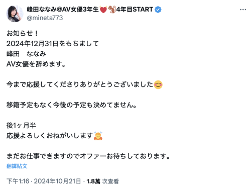 這次宣布引退的是在片商Madonna出道的「峰田ななみ(峰田七海)」,我們一塊兒來看看她在X(https://x.com/mineta773)上寫了什麼: