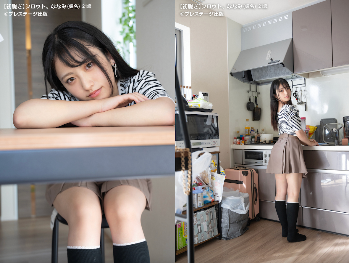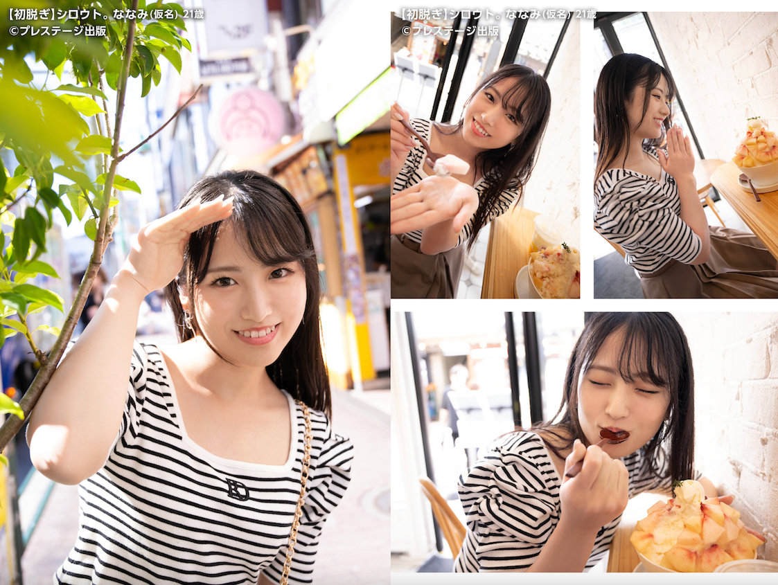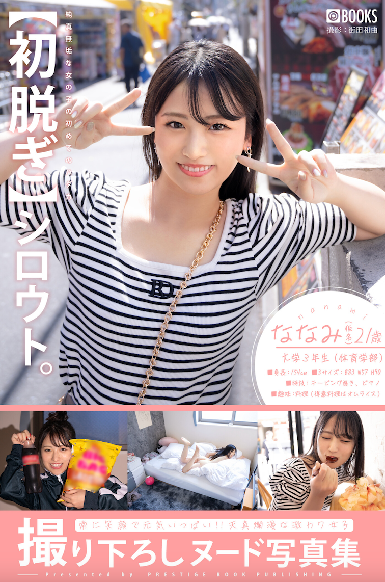 人是體育大學的現役大學生,雖然身高只有154公分,不過因為屁股很翹所以上學的時候總是能感受到四面八方射過來的「野獸視線」;也因為是相當青春的肉體,所以這本寫真集「【初脱ぎ】シロウト。ななみ(仮名)21歳 大学3年生(体育学部)」是以戀人視角出發,先是在大街上約會散步然後再一起去公園玩,最後再到了ななみ的家裡請她寬衣解帶,讓大家見識青春肉體的魅力〜