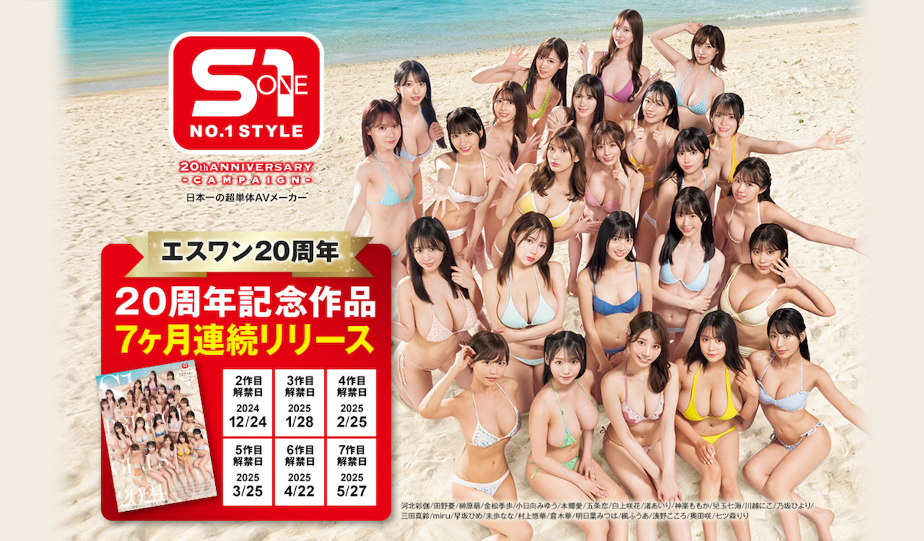 首先來看作品的部分:為了慶祝創業20週年就得來不易的成就,S1是一口氣準備了七支作品,這支24位女優合作的超級企劃是第一部,接下來12月24號,明年的1月28、2月25、3月25、4月22以及5月27日都會有作品上市,也就是說這個20週年慶將會有長達半年的慶祝活動ー至於那些慶祝創業20週年的特別企劃我還不知道內容,但女優的部分我想在這半年間這家資源豐富的片商會一直補充新鮮的肉體,應該不會像Madonna一樣要從其他片商找人用...