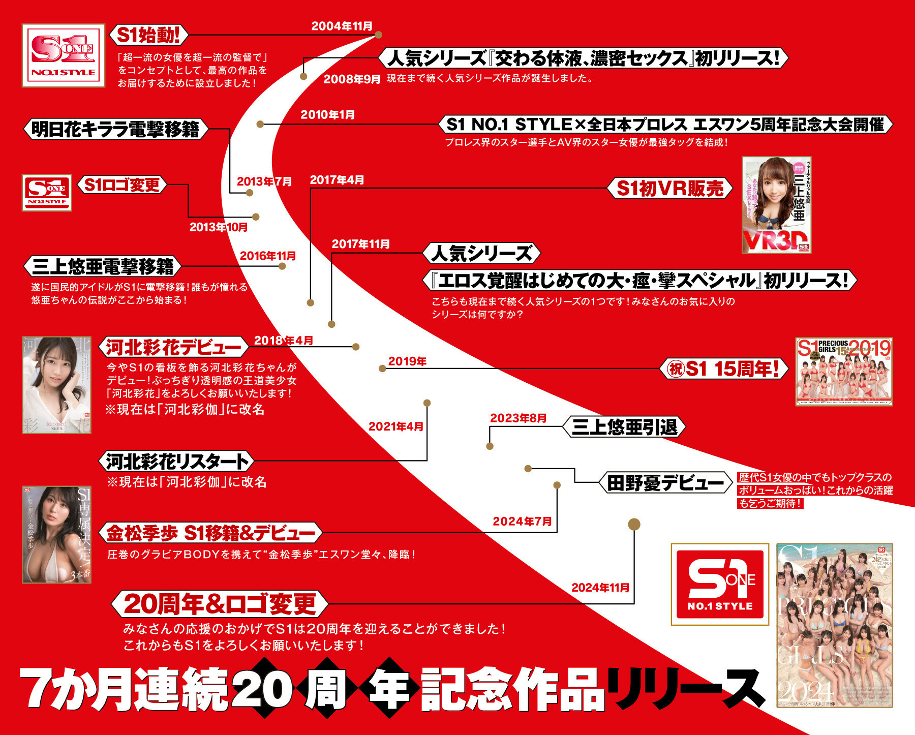 最後就是為了慶祝創業20年週,S1特別做了一張圖告訴大家創業維艱、這一路上發生了很多事:2010年以前的事就不提了,談到女優的第一件大事就是「明日花キララ(明日花綺羅)電擊移籍」,顯然能得到現在這位時尚教主效力非常令他們驕傲,接下來就是「三上悠亜電擊移籍」、「河北彩花出道」、「河北彩花再出發」、「三上悠亜引退」、「金松季歩移籍」以及「田野憂出道」ー所以L罩杯、Unbalance Body又胸又有腰又有纖細筷子腿的田野憂真的是非常重要,S1是把她視為明日花、三上、河北以及金松一樣重要的女優,真的超厲害呀....