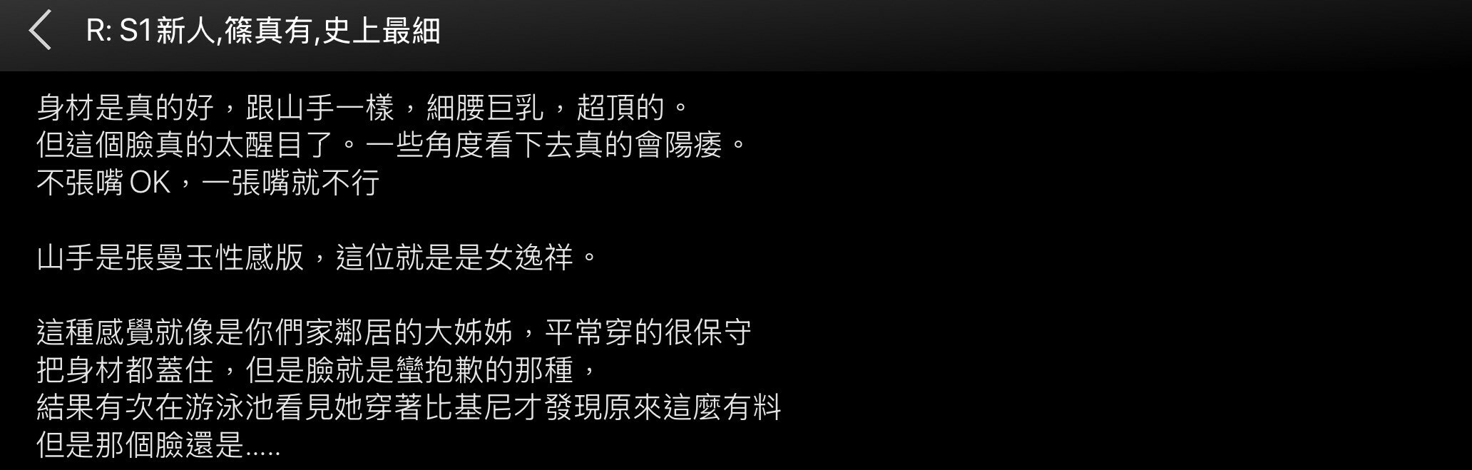 台灣論壇ptt對她的評價蠻慘的,說篠真有「一張嘴就不行」、還用「逸祥」來形容她,雖然細腰巨乳的身材超頂但還是不行,在推文更是有很多人質疑S1的選秀標準、覺得他們和賭神一樣今晚大失水準ー在這邊我無意和大家對著幹,要和大家說的是篠真有是知道自己的問題所在而且有積極應對的: