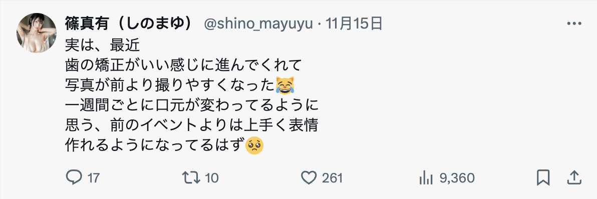 她在X上的推文有說,最近看到很多對自己的評論,不論好壞,都能成為努力的契機;接著她話鋒一轉,說最近牙齒矯正進展得很順利,感覺每一週最新都在變化,拍照比以前更容易了,應該可以比之前的活動更能做出好看的表情~