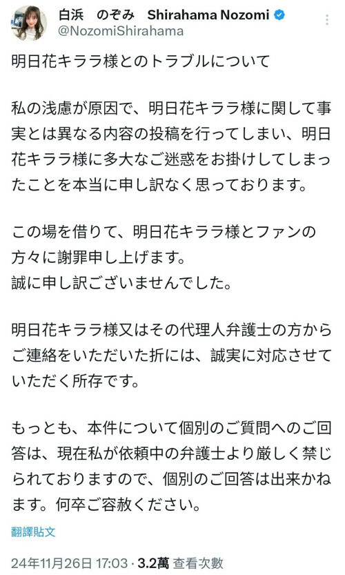 白浜のぞみ(白濱希)就道歉了。怎麼會這樣?我直接翻譯她的聲明吧: