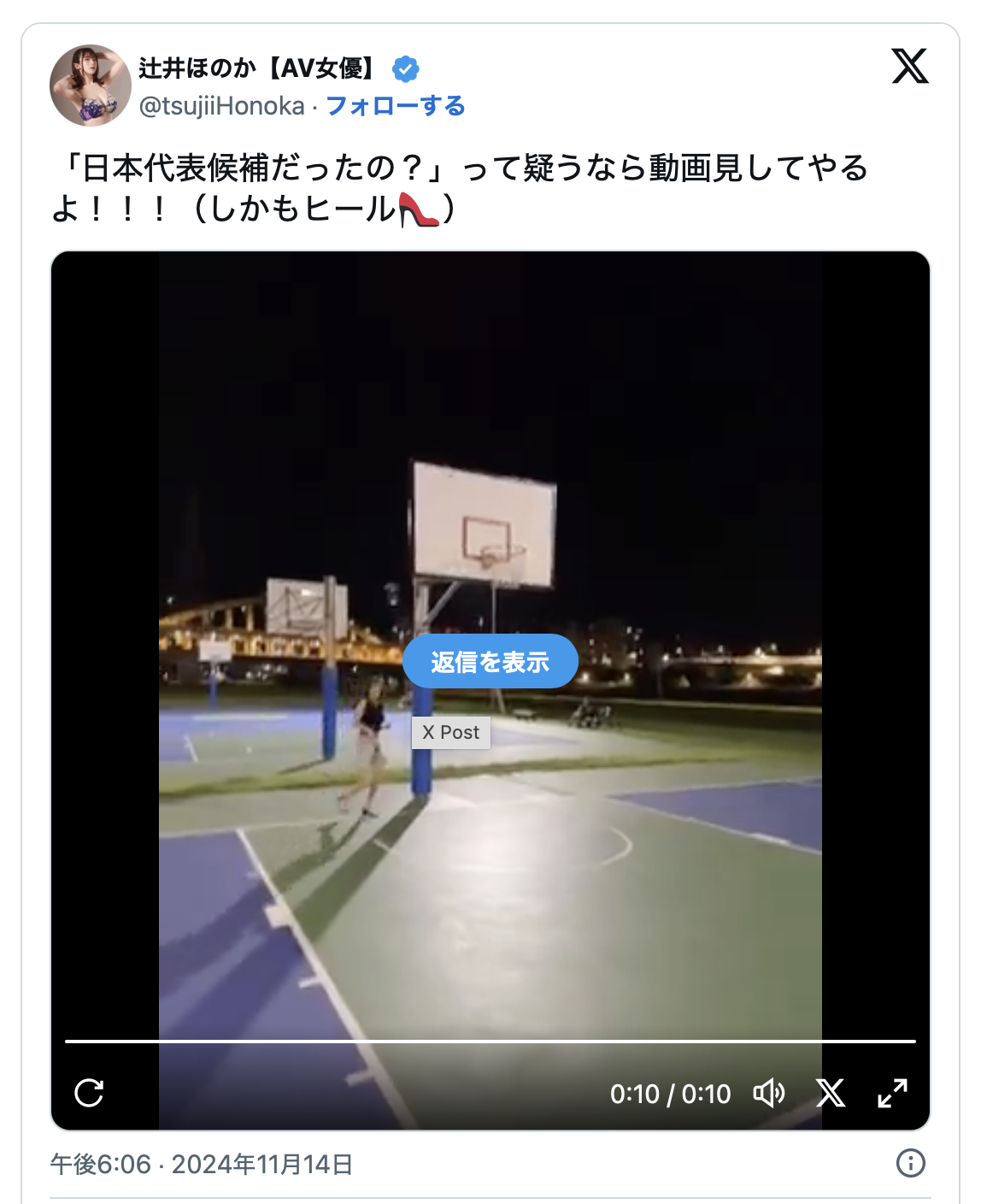 看了這支作品就知道,穿者運動服的辻井ほのか(辻井穗乃果)真是迷人,而且在球場上的基本動作也不含糊,也難怪片商敢說她有入選國家隊的實力;如果你懶得去找這支作品的話,沒關係,我們直接去看她的社群,這邊有她小人物上籃的影片: