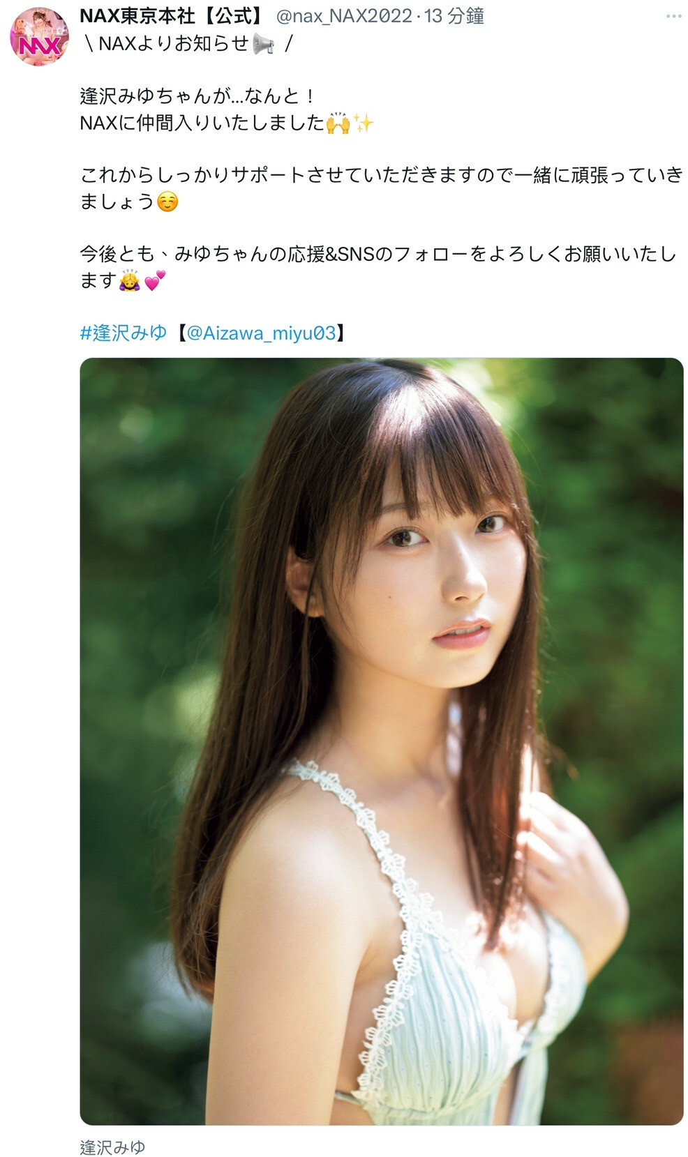 不過還好,優秀的女優不怕沒人要,在今天(12/1),逢沢みゆ(逢澤美優)於自己的X上宣布找到新東家了,是擁有了鈴村あいり(鈴村愛里)和伊藤舞雪的NAX promotion: