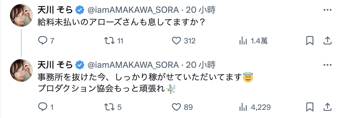 這當然很可惜,不過也不難理解啦,因為天川そら(天川空)應該對現有的體制很失望,從最近在X(https://x.com/iamAMAKAWA_SORA)的發文來看,當初她休息了好一陣子恐怕並不是身體出問題而是對經紀公司Arrows(アローズ)的強烈不滿,除了聲援向事務所44MANAGEMENT討薪水的ひなたなつ(日向夏)以及三浦るい(三浦瑠衣)外,她也自爆前事務所Arrows(アローズ)拖欠片酬,而且是好幾百萬⋯