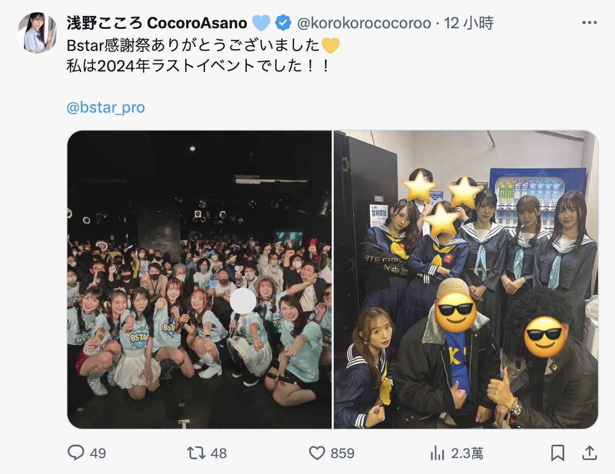 可能還沒辦法這麼樂觀,在另外一位女優「浅野こころ(淺野心)」的X(https://x.com/korokorococoroo)、一樣的照片她就把本鄉愛遮掉了,這絕對不是因為不喜歡本鄉愛(不然不要上傳照片就好了),而是現在本鄉愛還沒到可以公開露面的程度⋯