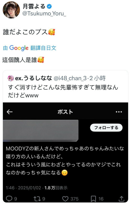 意思是「這醜女誰啊」,這話實在蠻難聽的,明明在TSE攤位互動的感覺不錯啊,是什麼事讓月雲よる(月雲夜)這麼不開心?