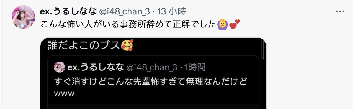 雖然漆なな(漆奈奈)追蹤很少還不到2000人,發文也遮掩了月雲よる(月雲夜)的帳號,不過還是被海巡到了,於是就有了月雲よる(月雲夜)一開始罵她是醜女的發文;後來沒多久月雲よる(月雲夜)就刪文了,但漆なな(漆奈奈)卻沒罷手,一連發了幾篇很「酸」的文: