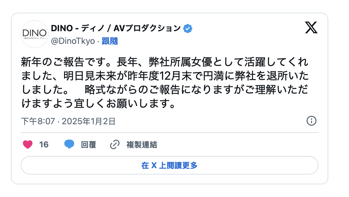 結果她的經紀公司Dino倒是先發聲了,他們在官方X(https://x.com/DinoTkyo)發文宣布明日見未来已經在去年年底退社、也就是辭職了ー這也就是說除非有其他經紀公司收留,否則明日見未来應該不會拍A片了,這也很符合她之前發文說不要期待她復活,果然,從她離開事務所這事來看她是真的沒打算拍A片惹〜
