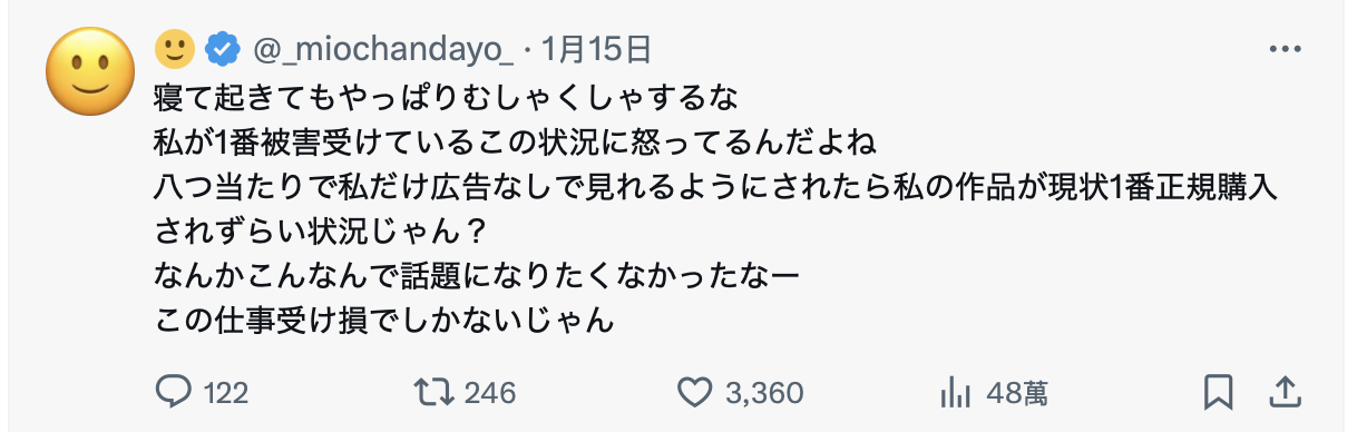 只因為遷怒我,讓我的作品被設為沒有任何廣告就能觀看的狀態,