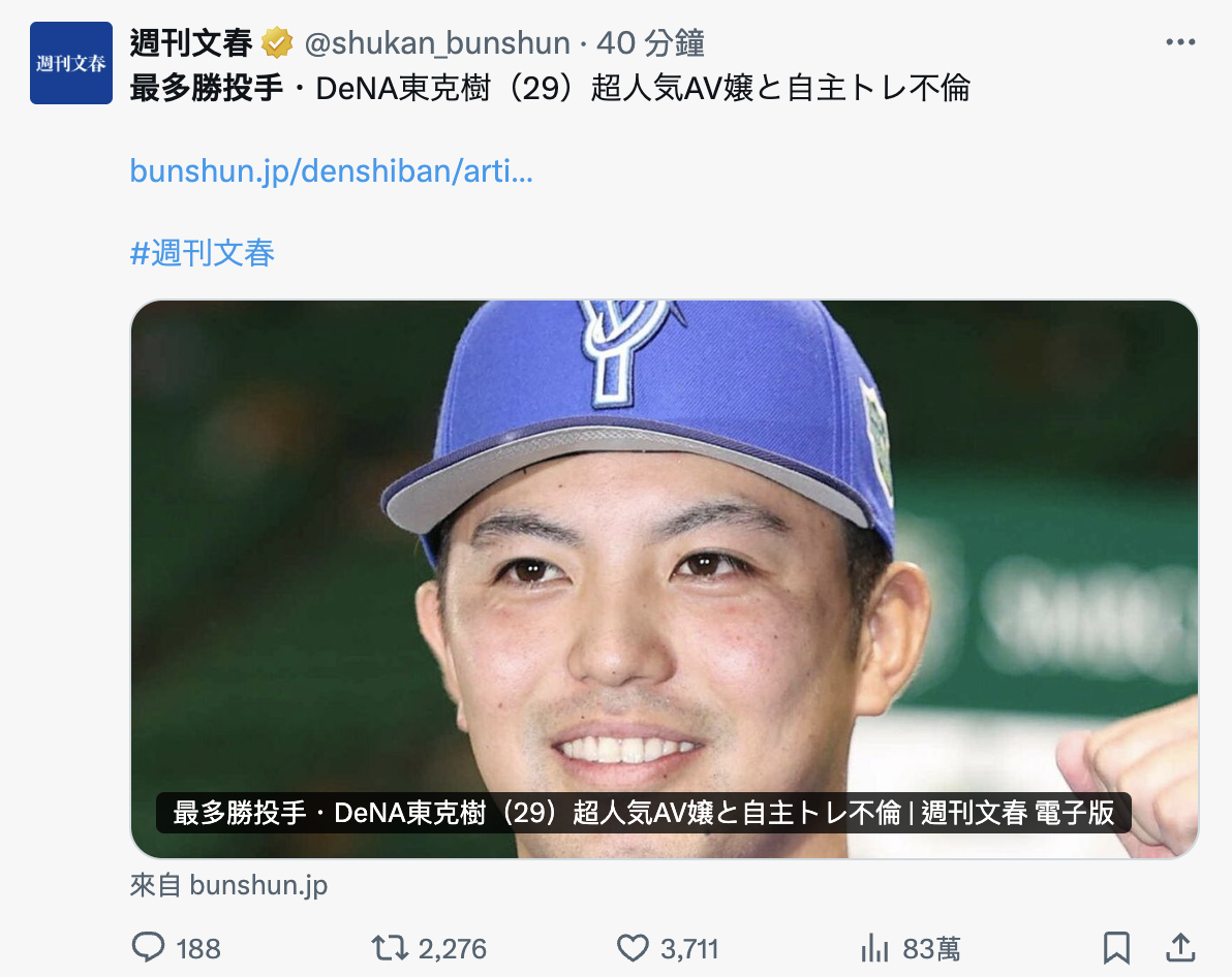 最多勝投手和AV女優的不倫,光看這標題就覺得很有爆點ー而在昨天晚上,已經有不少人注意到横浜DeNA的投「東克樹」個人的X消滅、IG也退光了所有追蹤而且還不準留言,更巧的是他正是2023年中央聯盟的最多勝投手,當年他拿下了16勝⋯