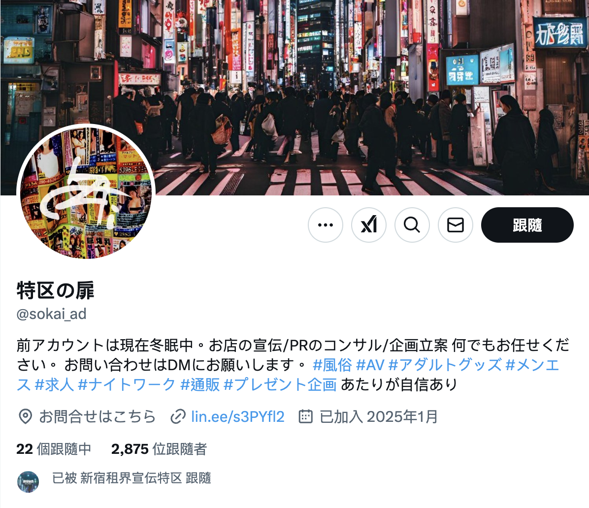 目前帳號的ID已經更改為「https://x.com/sokai_ads」,使用者名稱叫做「新宿租界宣伝特区」ー